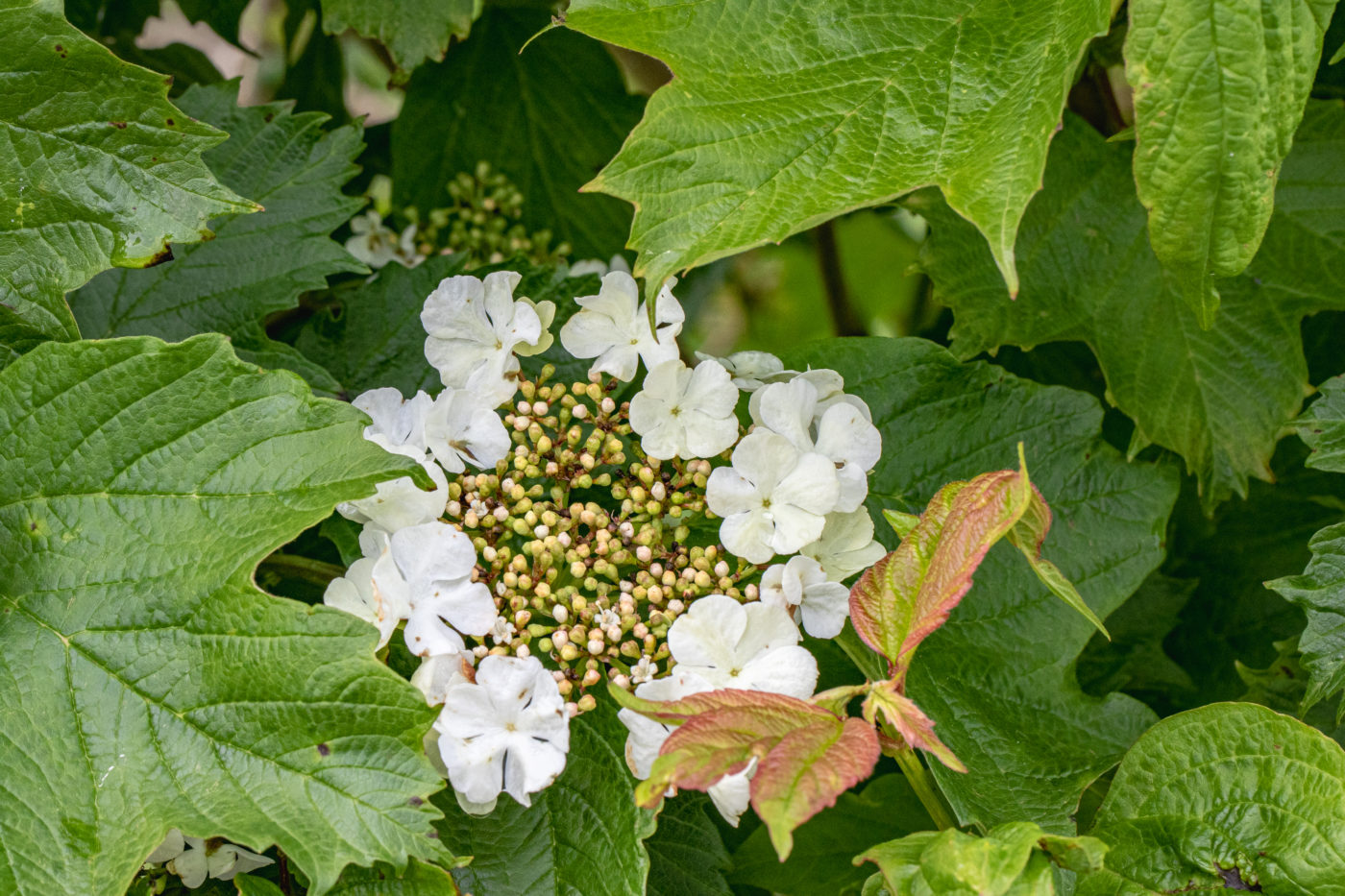 Gemeiner Schneeball (Viburnum sargentii) entlang eines oft gewählten Hundespazierweges bringt auch keine Abkühlung / Guelder rose along a dog walk with a small brook