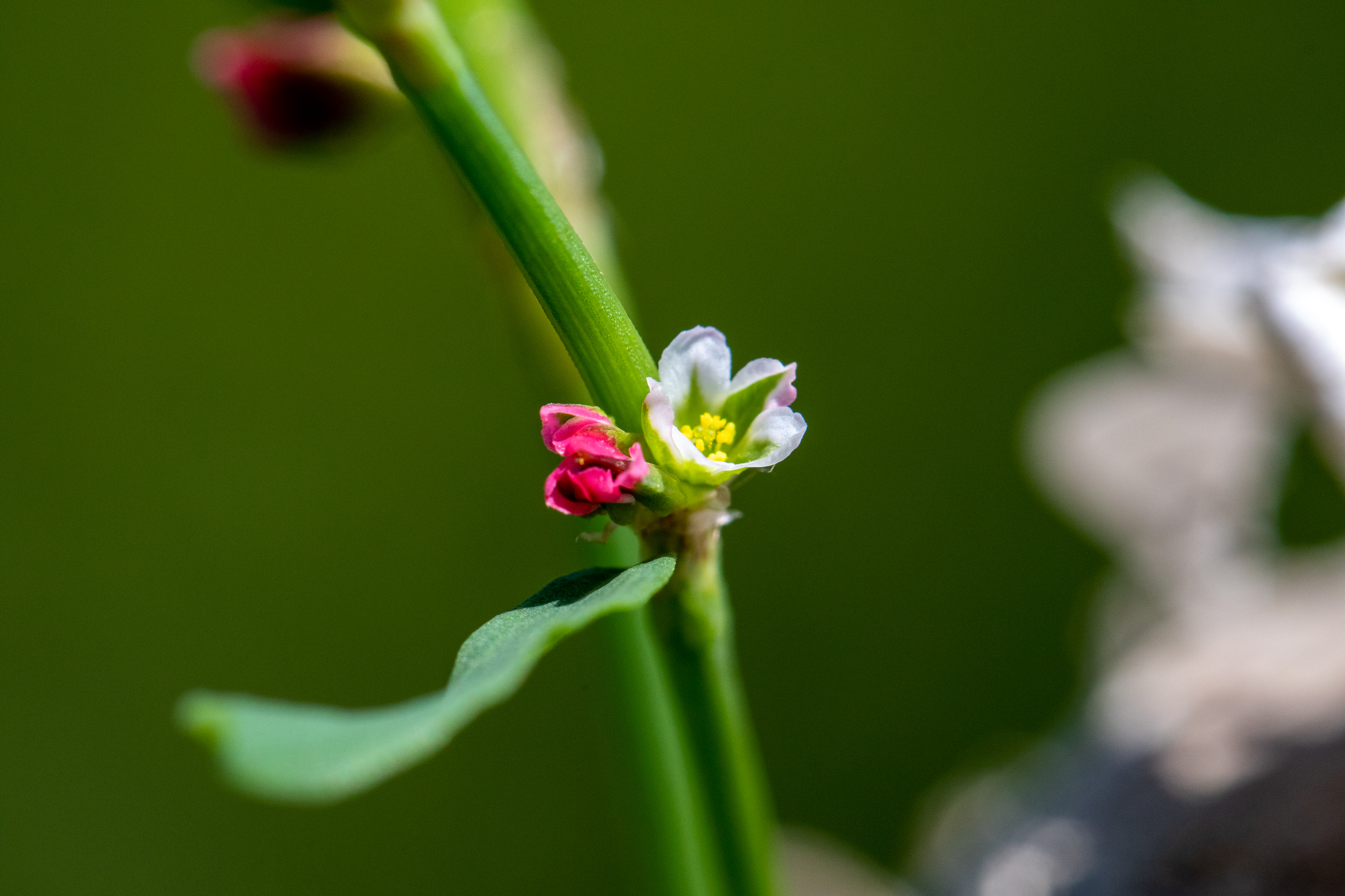 Natur pur – hübsche kleine Blüten des Vogelknöterichs (Polygonum aviculare) in naturbelassener Hecke / Tiny blossom of a common knotweed in untouched nature