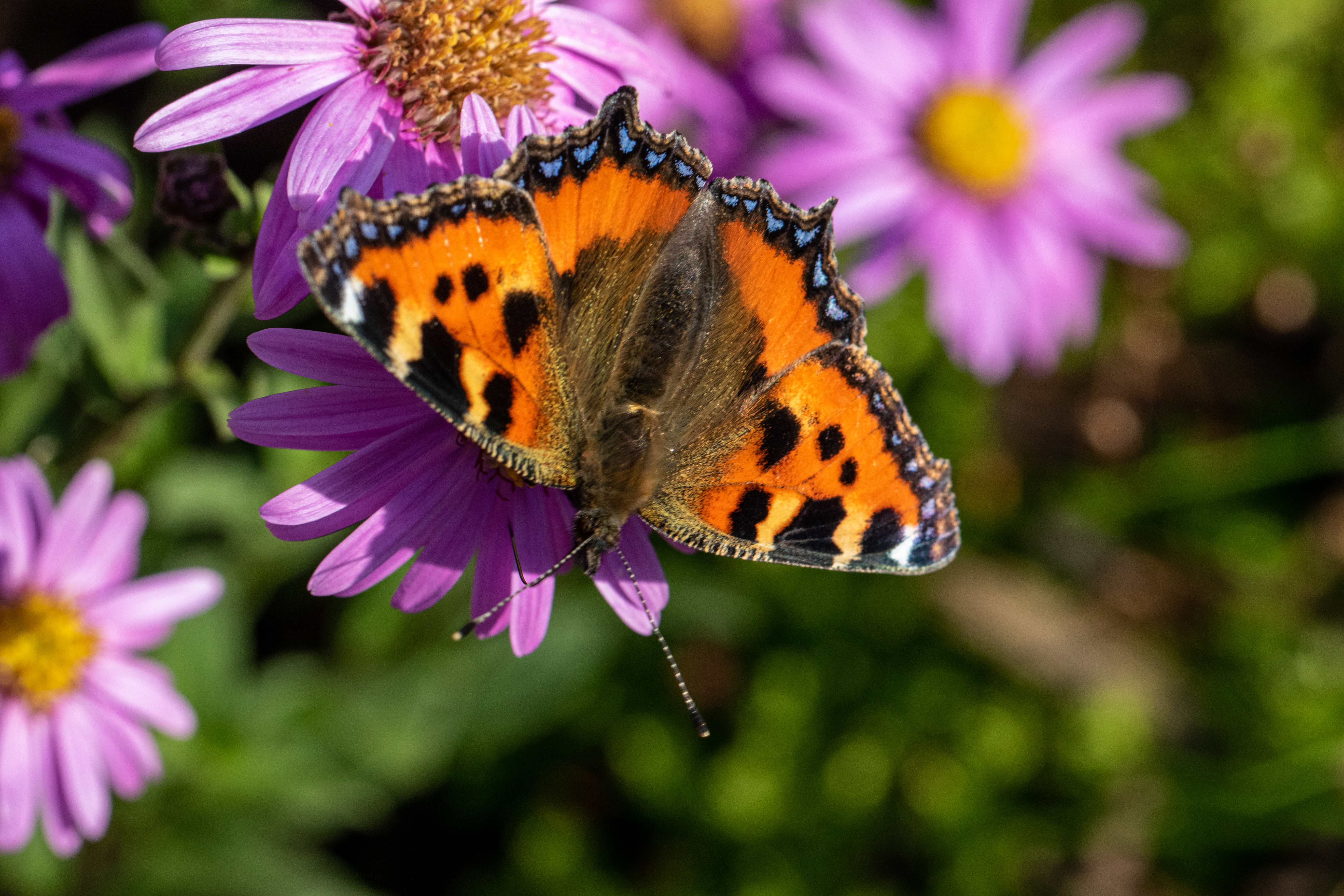Sie flattern scheinbar schwerelos in der Luft von Blüte zu Blüte. Sie verharren mal mit geschlossenen, mal mit weit offenen Flügeln und geniessen in der wärmenden Sonne Nektar. Die zarten, unterschiedlichst geformten Flügel schillern in verschiedenen Farben. Zu unserer Freude. Einen kurzen Sommer lang. Im Garten und unterwegs.